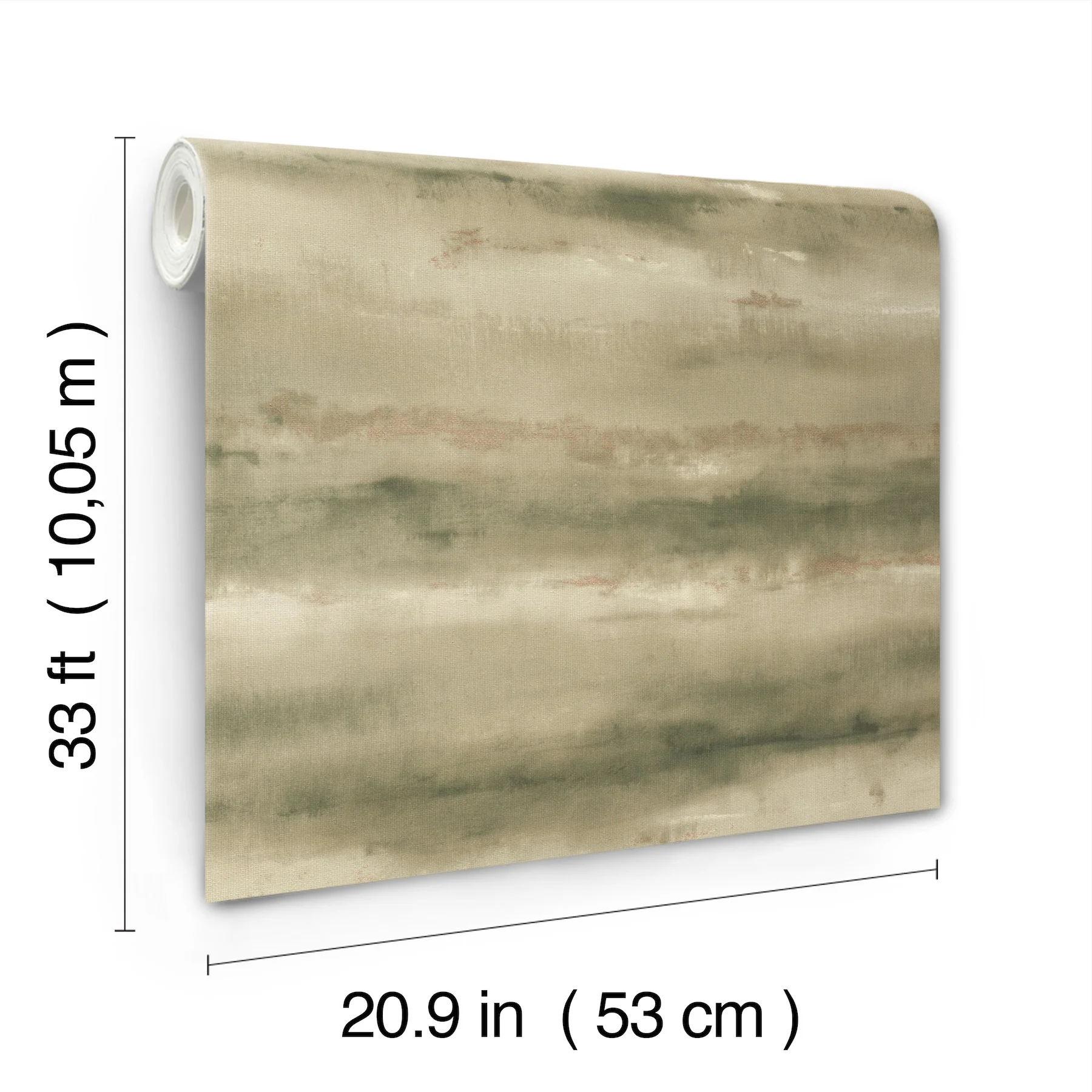 Wide washes of color form soft, organic striations accented by subtle metallic touches. Seen here in a mossy green palette embellished with brushes of metallic gold. Ayla is an unpasted, vinyl on non woven backing wallpaper measuring 20.9 inches wide by 33 feet long, covering approximately 57.5 square feet per roll.