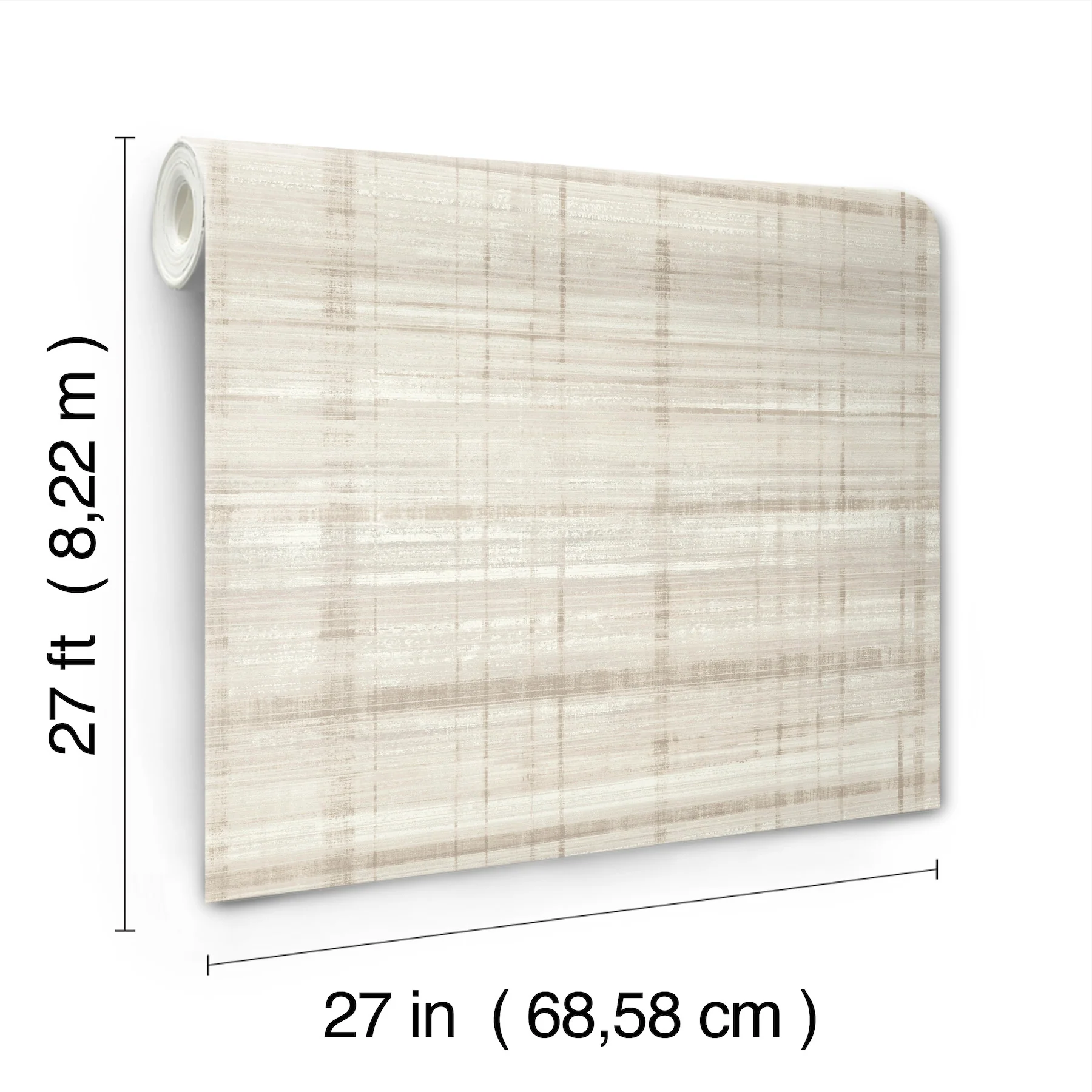 Vanishing Point's dense striations and textured detailing offer an abundance of sophisticated comfort. Featured here in shades of beige, taupe, and white. Vanishing Point is an unpasted, non woven wallpaper measuring 27 inches wide by 27 feet long, covering approximately 60.8 square feet per roll.